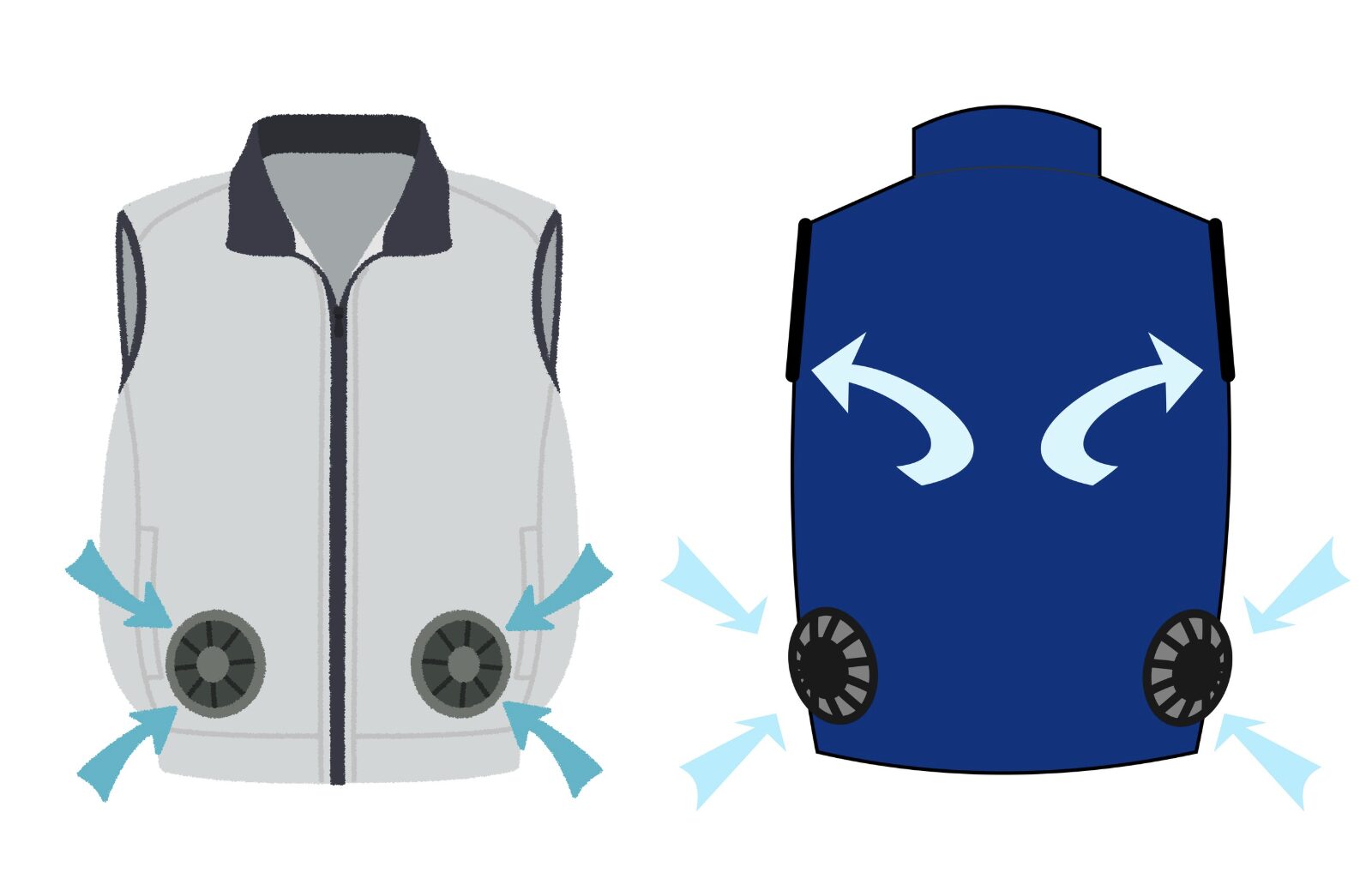 具体的には、汗の蒸発によって発生する「気化熱」を利用して体を冷却します。また、外気を服の中に空気を循環させることで、こもった熱を効率的に外へ逃がす効果もあります。ただし、汗をかいていなかったり、密封性が悪かったりすると、冷却効果が低下します。また、外気を服内に取り込む仕組みである以上、高温多湿環境で使用すると、涼しさをほとんど感じないこともあります。