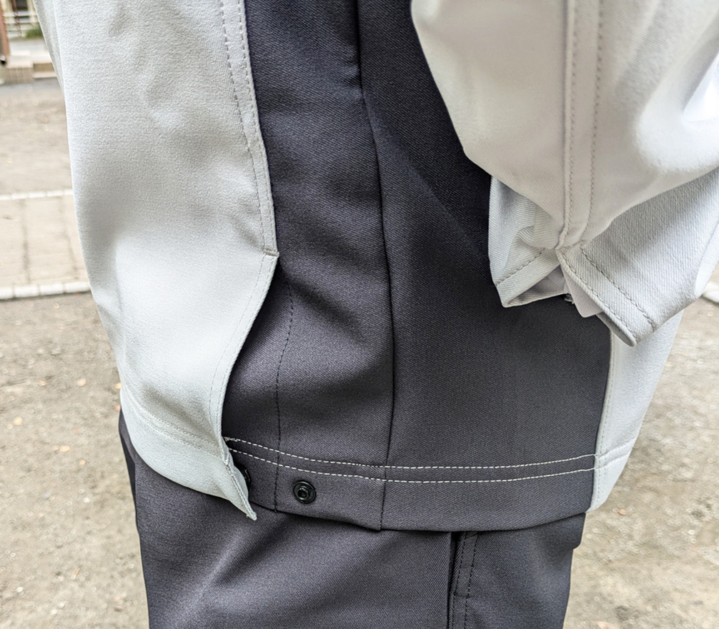 ボタンタイプなので必要に応じ、調整することができ従来と同じ機能を残しつつ、スマートなシルエットを実現。ストレッチ性、裁断や縫製の仕方を工夫し、細身のシルエットでも体の様々な動きをサポートします。