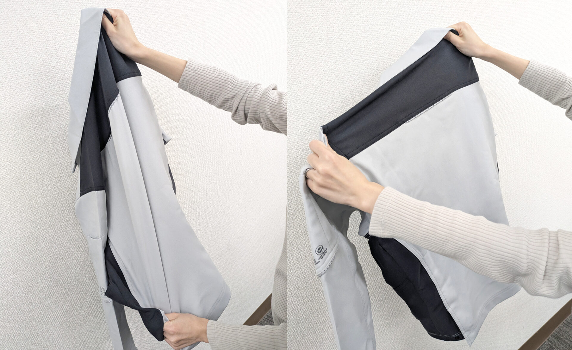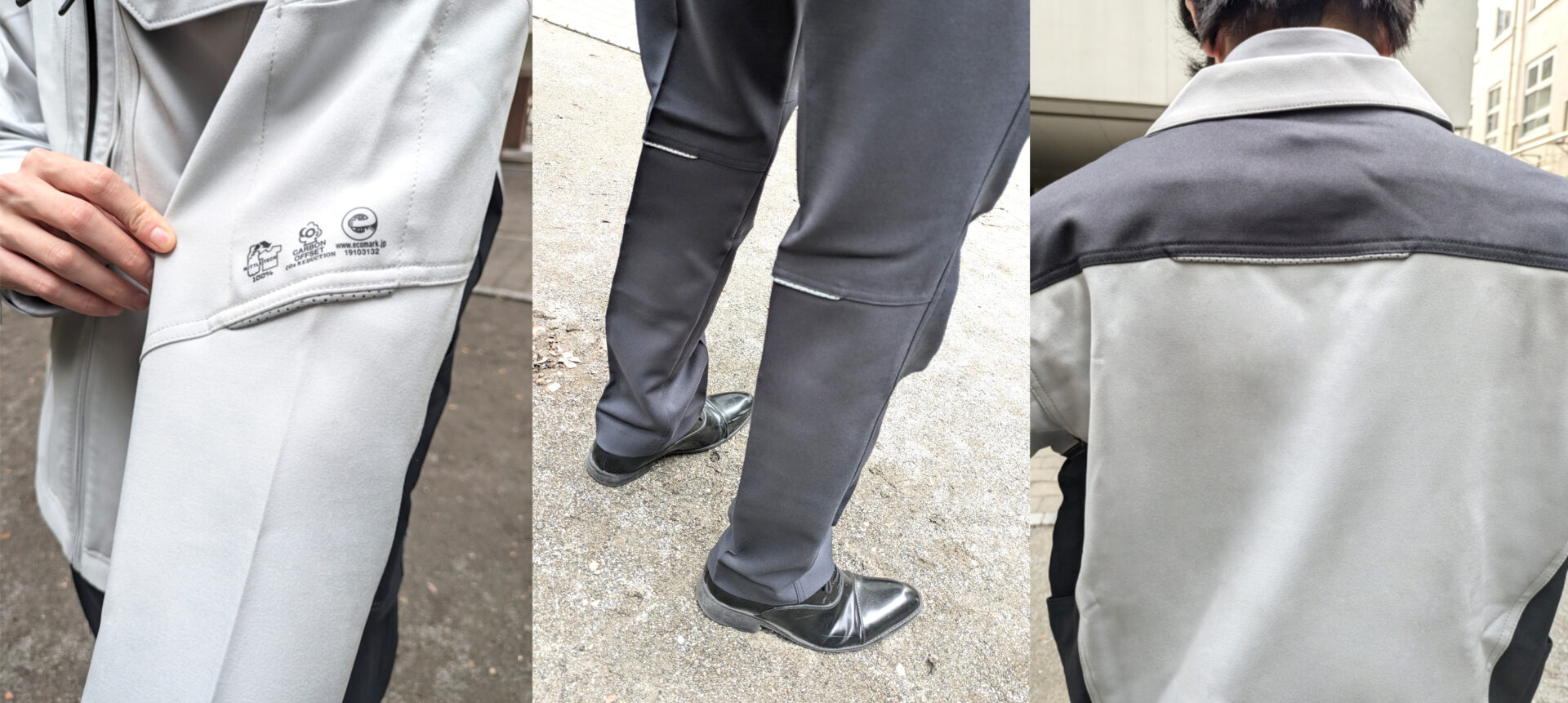 従来商品も様々な動きに対応できるよう考えられてはいました。ただストレッチ性のない生地で作られる商品は動きを妨げないようにどうしても大き目シルエットで作る必要があります。ストレッチ素材を使用することで、すっきりとしたシルエットでも体への負荷が少ないように改良されています。体を動かす業種は当然ですが、座りながらの業務が多い事務方のスタッフの方にも好評です!